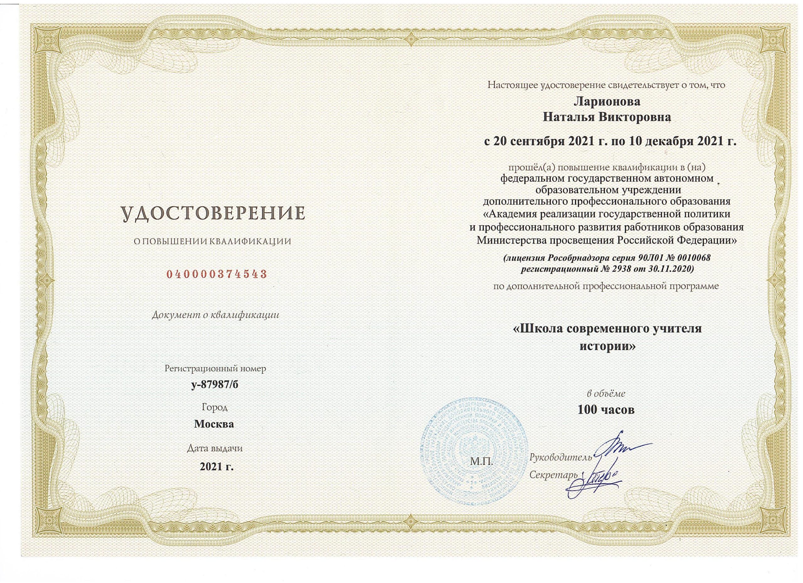 Диплом переподготовки Квалификация: соответствие занимаемой должности (Приказ от 05.12.2020 № 87, протокол №3 от 05.12.2020) Курсовая подготовка: «Школа современного учителя истории», 2021 год Общий стаж: 11 лет, педагогический: 11 лет Преподаваемые предметы: Преподаваемые предметы: история, обествознание |