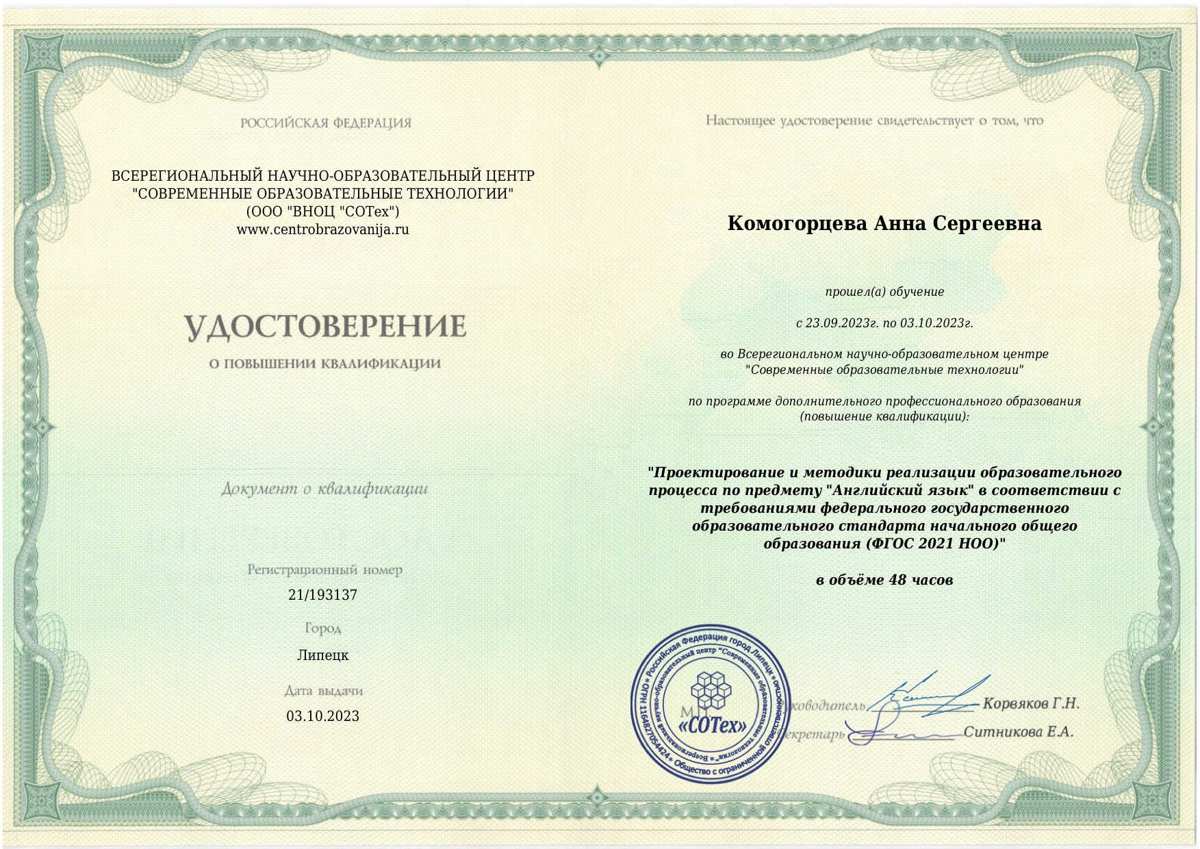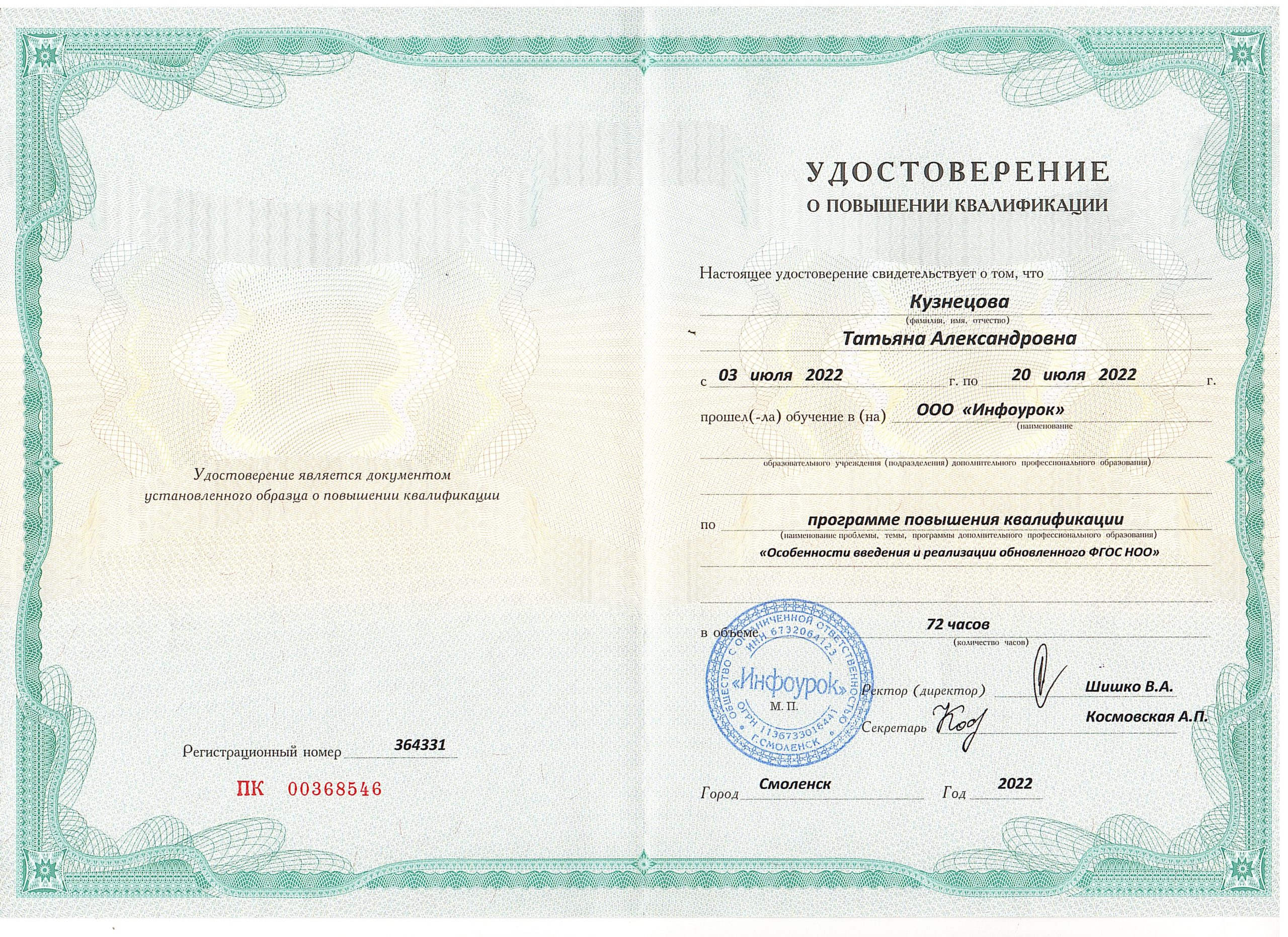 Диплом Заб ГПУ от 27.05.2002 ИВС 0006799, специальность учитель русского языка и литературы Квалификация: соответствие занимаемой должности (Приказ от 22.12.2021 № 102, протокол №3 от 22.12.2021) Курсовая подготовка: Общий стаж: 32 лет, педагогический: 32 лет Преподаваемые предметы: русский язык, литература, родной язык (русский), родная литература (русская) |